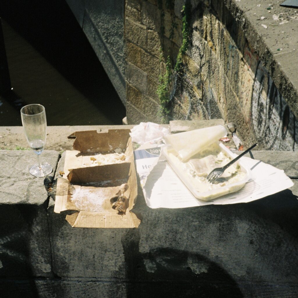 Overlooking the Spree river: an eclectic meal. A near-empty glass of Prosecco; a chicken bone cleaned off its skin in a pool of powdered sugar; the remains of a salad, drenched in dressing; a suspended fork. Who put this hodgepodge together? More important still: why was it abandoned so hastily?