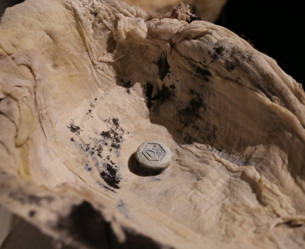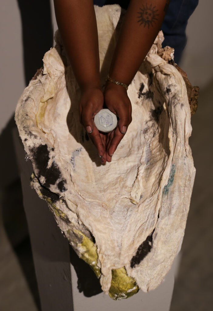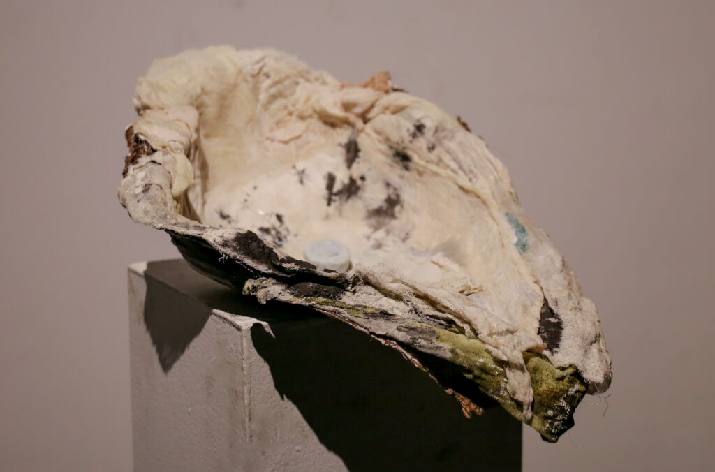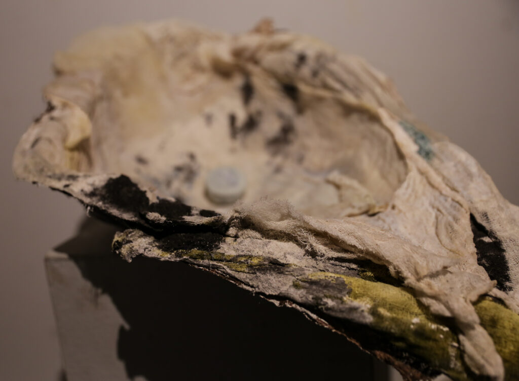 “World’s Your Oyster” provokes a nuanced dialogue on the value and perception of birth control. Central to the piece, a birth control pill is enshrined like a rare and valuable pearl. The shell, crafted from cheesecloth and coated with polyurethane, juxtaposes softness with a hard, pearlescent sheen. This material and symbolic interplay compels viewers to contemplate the multifaceted nature of birth control, encapsulating both its empowering potential and the complexities it brings to women’s lives.