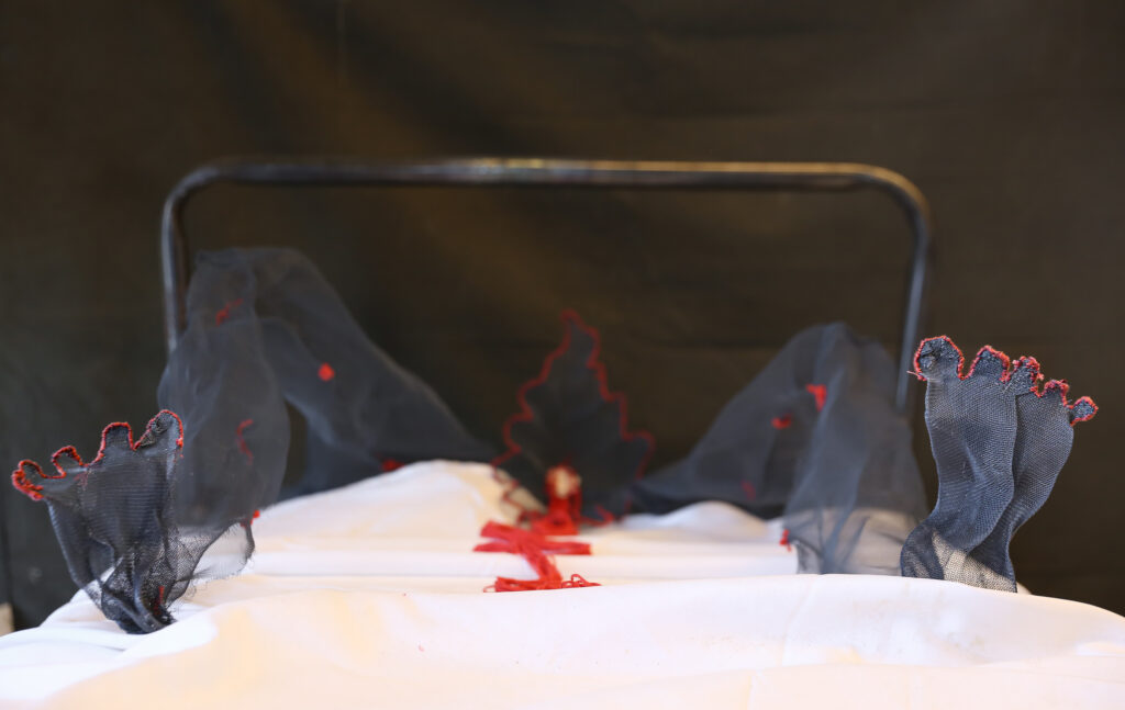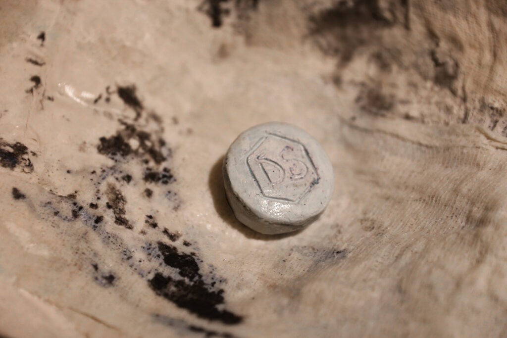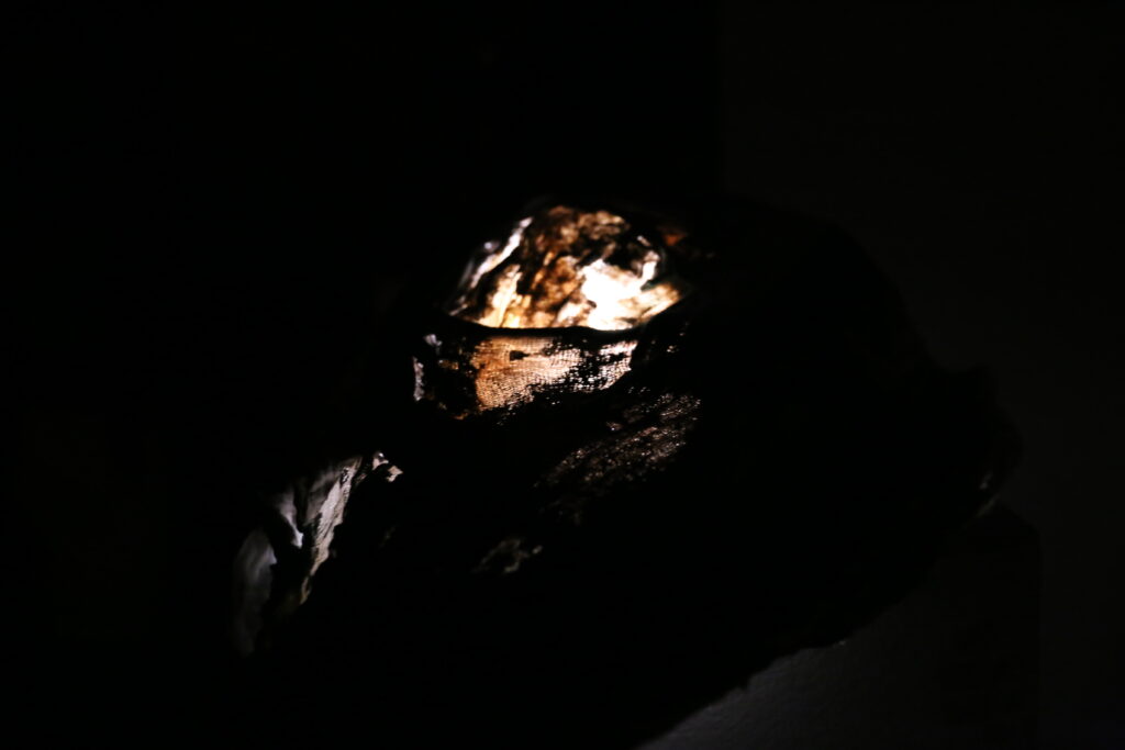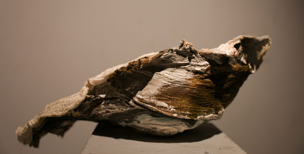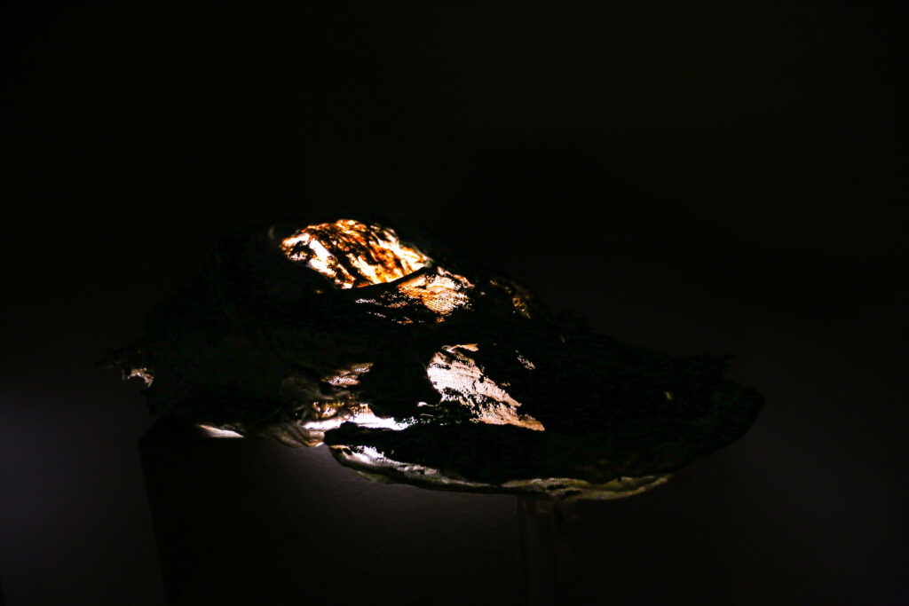 “World’s Your Oyster” provokes a nuanced dialogue on the value and perception of birth control. Central to the piece, a birth control pill is enshrined like a rare and valuable pearl. The shell, crafted from cheesecloth and coated with polyurethane, juxtaposes softness with a hard, pearlescent sheen. This material and symbolic interplay compels viewers to contemplate the multifaceted nature of birth control, encapsulating both its empowering potential and the complexities it brings to women’s lives.
